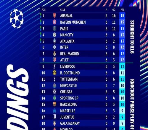 北京时间12月11日,欧冠联赛第六轮比赛全部结束,联赛阶段的比赛还剩2轮,目前阿森纳、拜仁、巴黎、曼城、亚特兰...