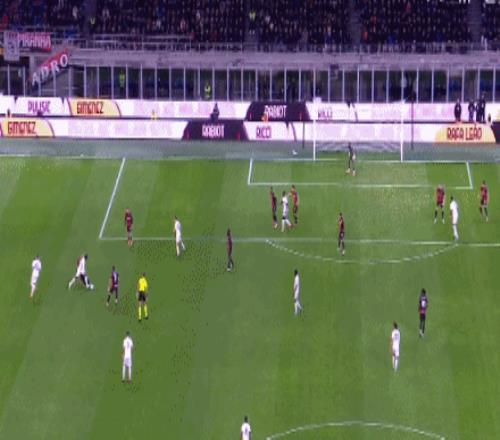 被弱旅将比分追平,AC米兰如梦方醒,加强了攻势,第63分钟,AC米兰左路围攻,莫德里奇45度角拿球横切摆脱防守后直塞,弗法纳禁区弧顶左侧策应脚后跟巧妙做球,莱奥禁区内接球获得很好的机会,莱奥稍作调整大力轰射,BOOM的一声皮球被横梁挡了出来。第85分钟,比萨后场进攻,连续的传递,阿金桑米罗中圈处接球摆脱防守倒地送出超远距离过顶长传,恩佐拉反越位成功场上禁区弧顶处将球卸下获得超级单刀机会,恩佐拉操作调整后冷静穿裆推射得手,比萨连追2球2:1反超了比分。梦幻开局到落后,最后10来分钟AC米兰展开猛烈攻势,补时第2分钟,AC米兰左侧角球机会,一个战术配合后,莫德里奇禁区边上接球横传中路,阿特卡梅禁区弧顶前调整好脚步直接迎球超远距离大力抽射,皮球击中近端门柱内侧弹入网窝,AC米兰2:2绝平比萨。