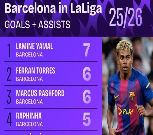 巴萨5人西甲直接参与至少5球,本赛季五大联赛仅此一家