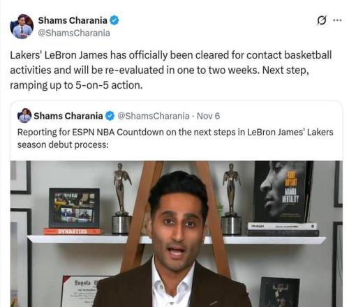 需要关注的是,湖人队超级巨星勒布朗詹姆斯本赛季一直在养伤中。不过,詹姆斯的伤情也迎来了2大利好。第1、NBA著名记者Shams Charania报道,詹姆斯已正式获准参加对抗性篮球训练,并将在一到两周后重新评估。下一步,他将逐步恢复到五对五的全场比赛。湖人队随后官宣了这一消息。