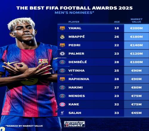 北京时间11月7日,国际足联官方公布了2025FIFA年度最佳球员候选,登贝莱、亚马尔、姆巴佩、凯恩等球员在列。德国《转会市场》给出了这11名球员的身价排行: