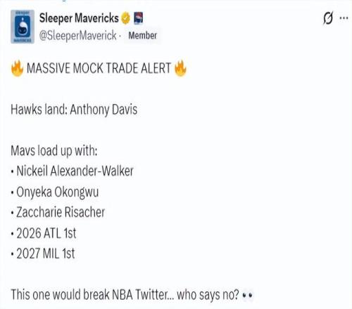 独行侠媒体认为一个里萨谢根本无法满足球队,他们希望老鹰送出亚历山大-沃克、奥孔古、里萨谢、2026年老鹰首轮、2027年雄鹿首轮来换浓眉,也就是5换1,可这个方案老鹰管理层能认可吗?