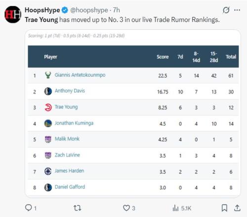 根据美媒HoopsHype的预测,扬尼斯是交易流言榜单第一,戴维斯是第二,特雷杨已经上升到第三,库明加才第四。