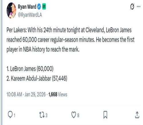 正如米切尔所说,詹姆斯是为骑士奠定基础的存在,他的生涯也足够伟大,本场詹姆斯依旧扮演着纪录收割机角色,本场出战27分钟后,詹姆斯出场时间正式超过6万分钟,成为NBA历史上首位创造这一壮举的球员,贾巴尔以57446分钟排在第二。