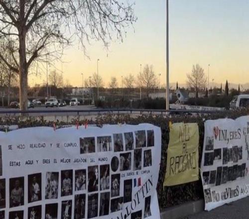 当地时间2月20日,皇马球迷在皇马体育城外悬挂横幅,声援维尼修斯与姆巴佩,力挺二人反对种族歧视的行为。横幅上...